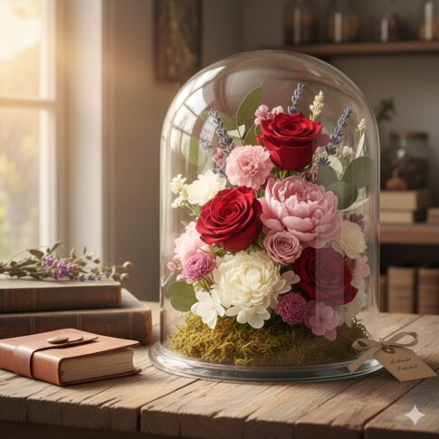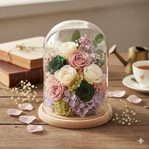 バラを中心にしたガラスドームアレンジは、ギフトとして特に人気です。ほこりや湿気から守れるため、長持ちしやすいのも魅力です。