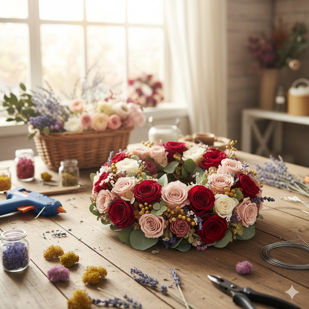 プリザーブドフラワーリースを美しく作るためには、作業を始める前の準備がとても大切です。準備が整っていると、花材が扱いやすくなり、グルーガンの安全性も高くなります。特にプリザーブドフラワーは繊細な素材なので、落ち着いて作業できる環境づくりが仕上がりの美しさにつながります。