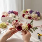 また、フラワーワイヤーやフローラルテープ、グルーガンなどの道具を使うことで、花材をしっかり固定しながらきれいな形を作ることができます。初心者の場合は、材料セットを利用することで準備の手間を減らすこともできます。