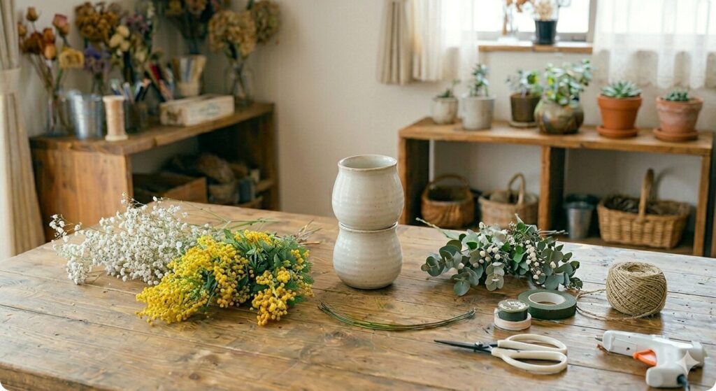 ミモザのプリザーブドフラワーアレンジを作るためには、まず花材と道具をしっかりそろえることが大切です。基本の花材としてはミモザを中心に、グリーンや白い小花を組み合わせるとナチュラルで可愛いアレンジになります。