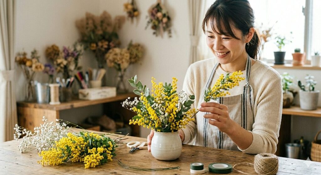 例えば、私がフラワーアレンジを教えるワークショップでミモザを使ったアレンジを紹介したときのことです。初心者の参加者の方に「どの花が一番作りやすかったですか?」と聞くと、多くの人がミモザを選びました。その理由として「ふんわりしているので多少配置がずれても自然に見える」「初心者でも可愛く仕上がる」という声が多くありました。