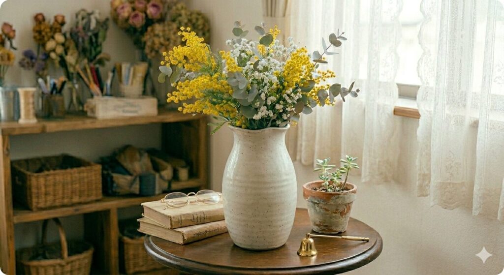 私が初めてミモザアレンジを作ったときは、ミモザとユーカリ、そして少量の白い小花だけを使いました。材料はシンプルでしたが、完成したアレンジはとても春らしく、部屋に飾ると空間が一気に明るくなりました。