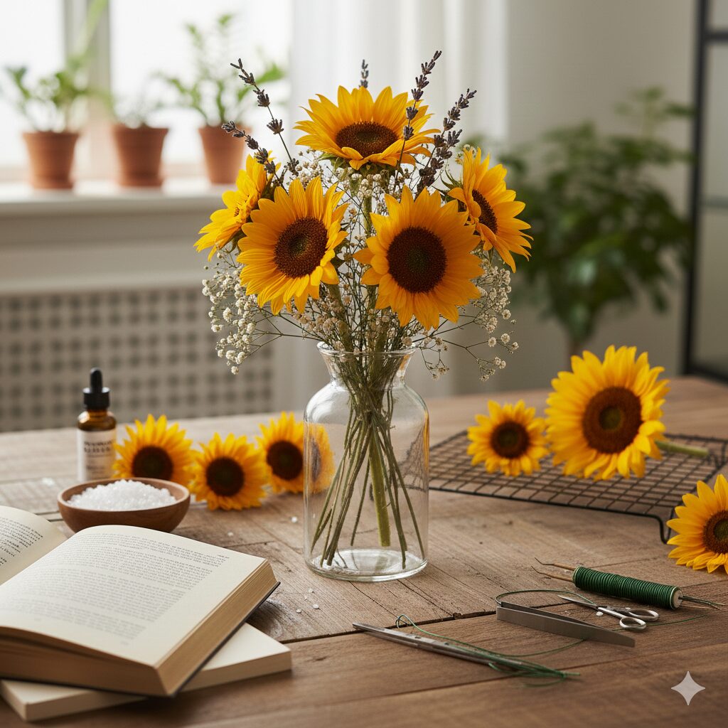 ひまわりのプリザーブドフラワー作りは、一見むずかしそうに感じるかもしれません。しかし、実際は「材料選び」「下処理」「浸け込み」「乾燥」の流れを丁寧に行えば、初心者でも十分に美しい仕上がりを目指せます。特にひまわりは花そのものの存在感が強く、多少形にばらつきがあっても魅力が損なわれにくいため、初めてのプリザーブド加工にも向いている花材といえます。