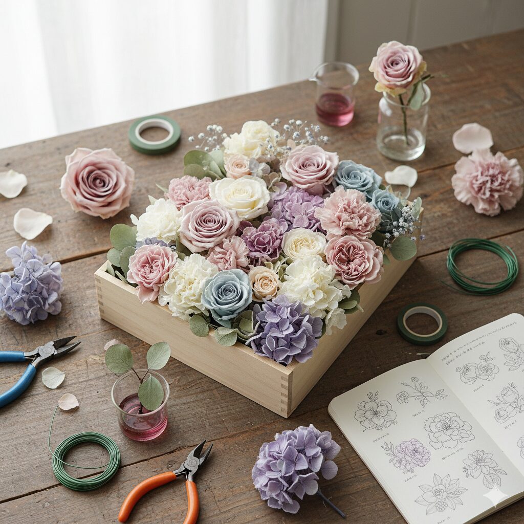 プリザーブドフラワーの作り方で失敗しないためには、正しい材料と道具を揃えることがすべての出発点です。特別なスキルは不要ですが、道具の質や環境づくりによって仕上がりが大きく変わります。