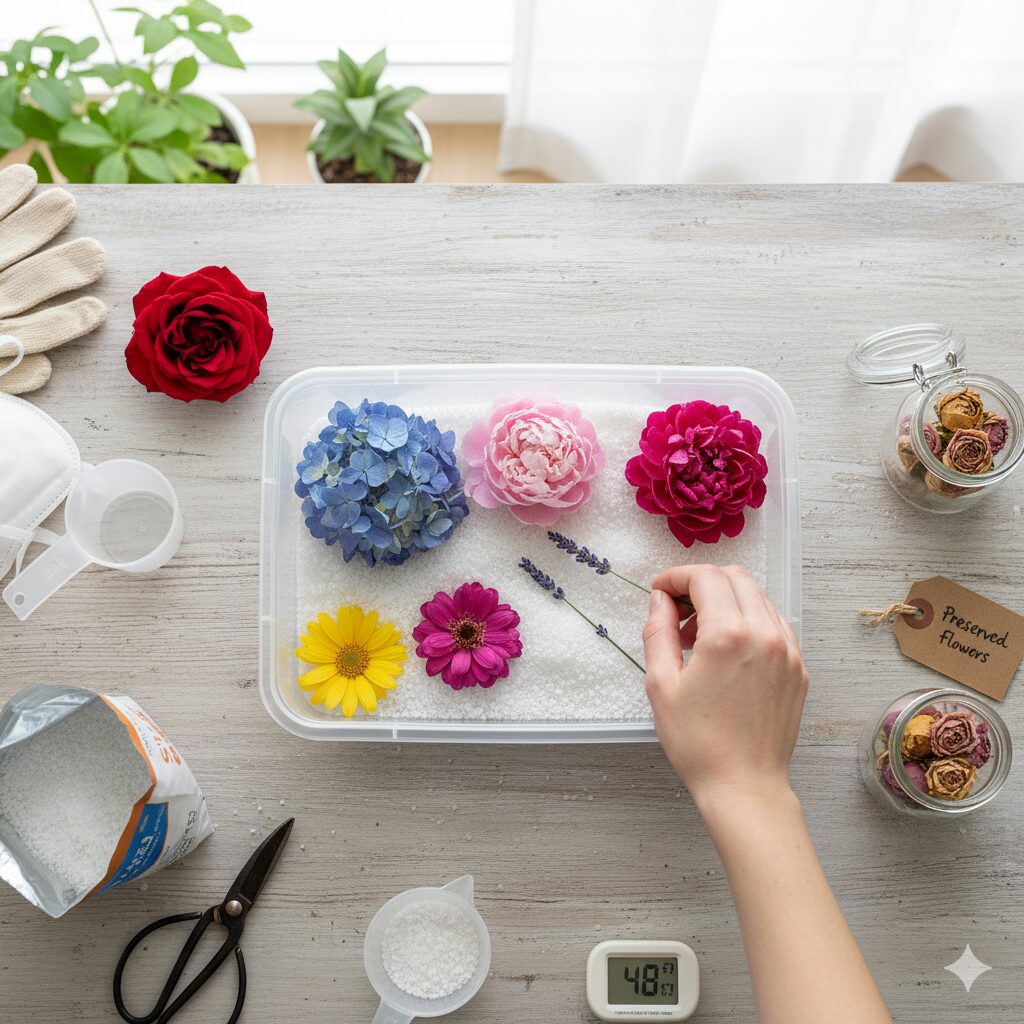 シリカゲルを使ったプリザーブドフラワー作りは、基本をしっかり押さえれば初心者でも十分に美しく仕上げられます。この章では、実際の作業手順を4つのステップに分けて、わかりやすく丁寧に解説していきます。
